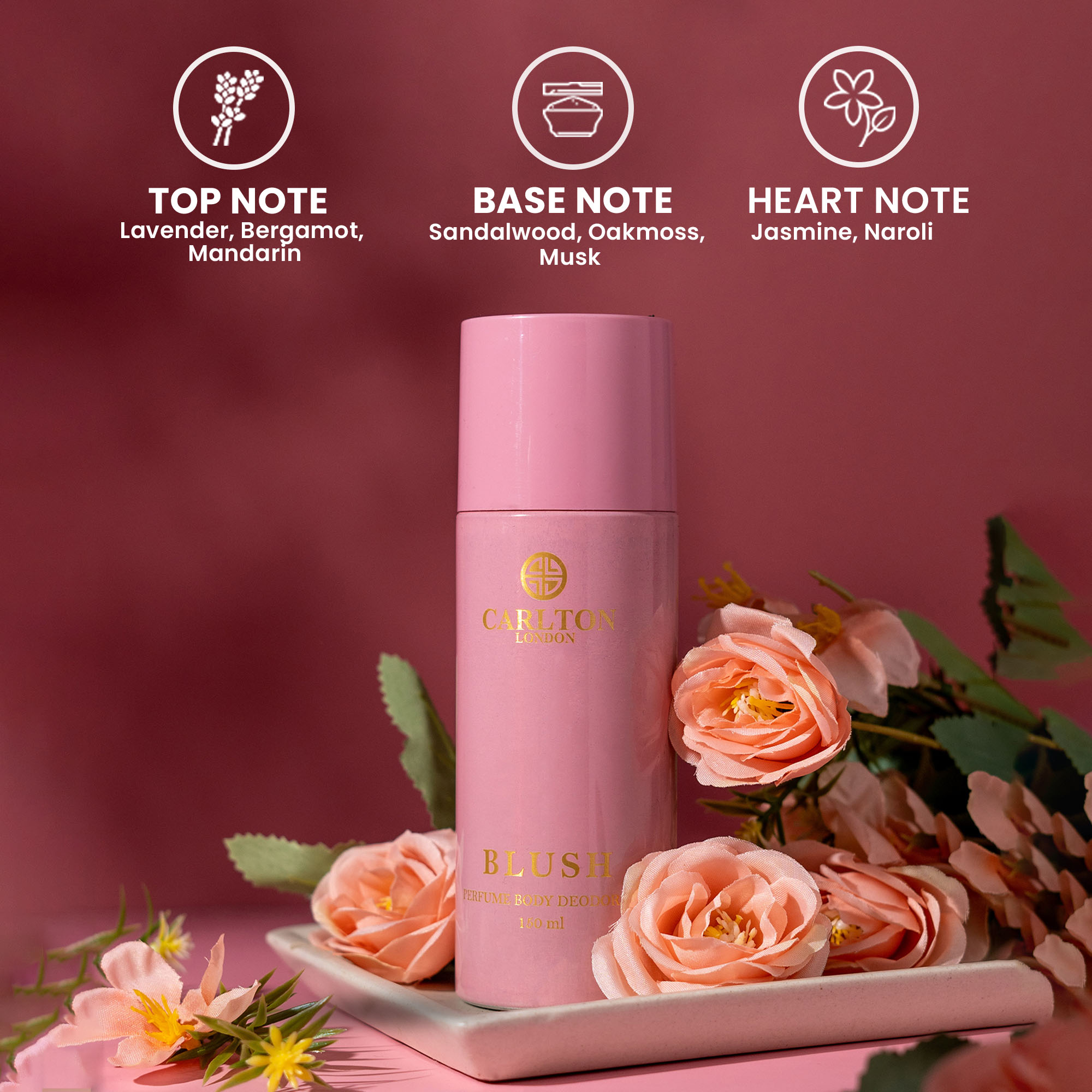 Carlton London Lush Deo has sophisticated fragrance notes of zesty mandarin, wild rose, sandalwood, musk and iris.