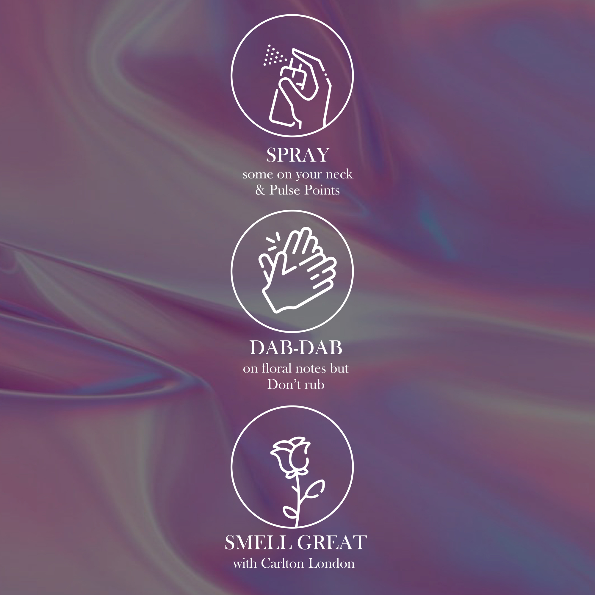 Hold the Perfume Bottle at a distance of 15 cms from your body and spray the fragrance directly to your skin. Spray it onto your pulse points. Fragrance is intensified by the warmth of your own body.