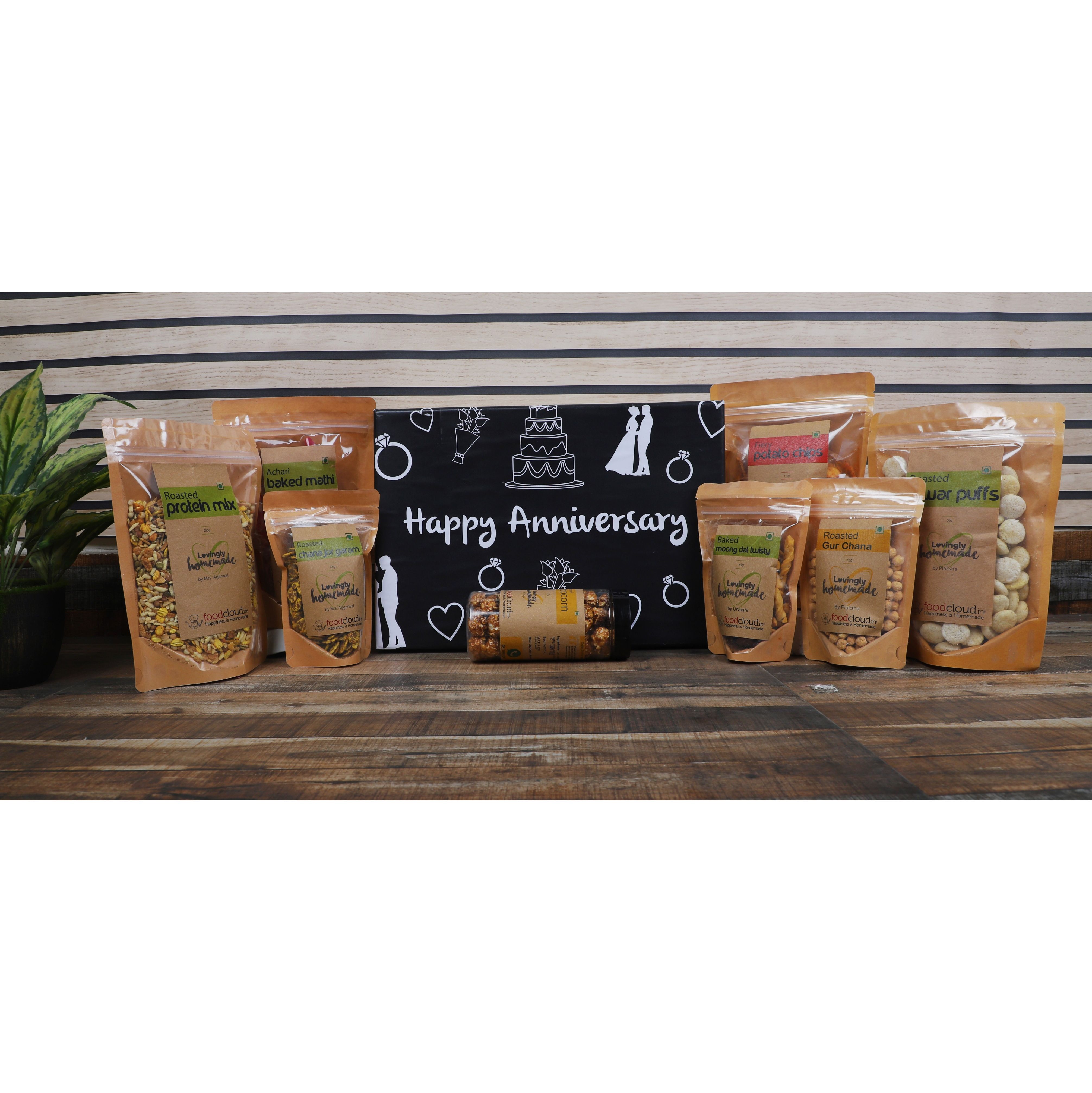 Celebrate love with a beautifully presented hamper of Homemade munchies and delight the couples anniversary day! This is also the perfect gift, consisting of tasty treats to be shared with your love celebrating the joy of togetherness.Includes:- Baked Mathi, Caramel Popcorn, Baked Moong dal Twisty, Roasted Chana Jor Garam, Roasted Protein Mix, Roasted Gur Chana, Roasted Jowar Puffs, Fiery Potato Chips